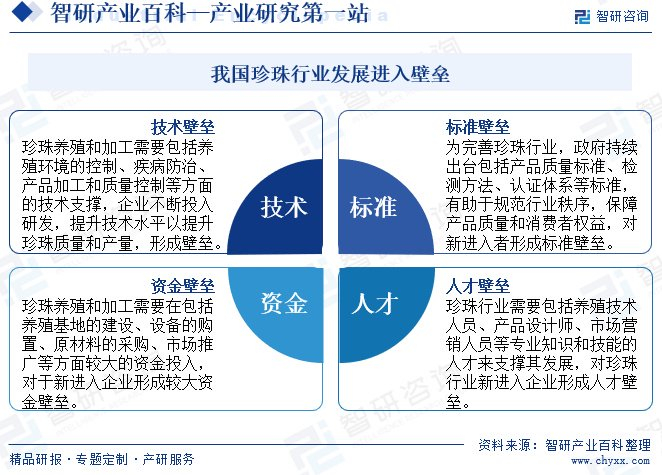 我国珍珠行业面临着多重进入壁垒,其中技术壁垒是行业发展的基石,要求企业在养殖环境控制、疾病防治、产品加工和质量控制等方面具备深厚的技术功底,以应对日益激烈的市场竞争。标准壁垒则规范了行业秩序,保障产品质量和消费者权益,企业需要投入资源理解和遵守一系列国内外标准和规范,确保产品的合规性和市场竞争力。资金壁垒则是行业发展的重要考验,珍珠养殖和加工需要大量的资金投入,对规模较小的企业而言,资金压力尤为突出。人才壁垒也是不可忽视的一环,珍珠行业需要具备专业知识和技能的人才来支撑其发展,但目前行业内的人才储备相对不足,培养和引进人才成为企业突破壁垒、实现可持续发展的重要任务。行业进入壁垒既考验着企业的实力与智慧,也推动着珍珠行业向着更高质量、更高标准的方向发展。