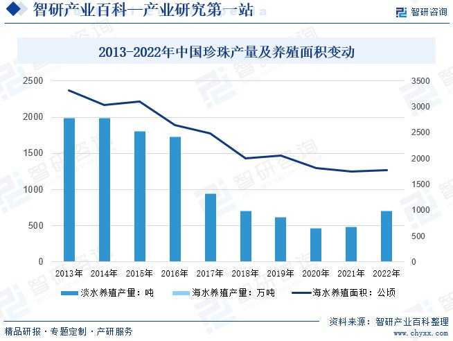珍珠是一种古老的有机宝石,主要产于珍珠贝类和珠母贝类软体动物体内。珍珠为贝类内分泌作用而生成的含碳酸钙的矿物珠粒,由大量微小的文石晶体集合而成的。数据显示,2020年中国海水珍珠养殖面积为1811公顷,同比下降12.1%。2021年我国海水珍珠养殖面积为1745公顷,2022年我国海水养殖面积1769公顷,同时我国珍珠产量在国内逐年下降,2020年中国珍珠养殖产量为456.5吨,同比下降25.4%;2021年我国珍珠养殖产量477.09吨,2022年我国珍珠养殖产量697.7吨,其中海水珍珠养殖产量为2.31吨,淡水珍珠养殖产量为697.39吨。
