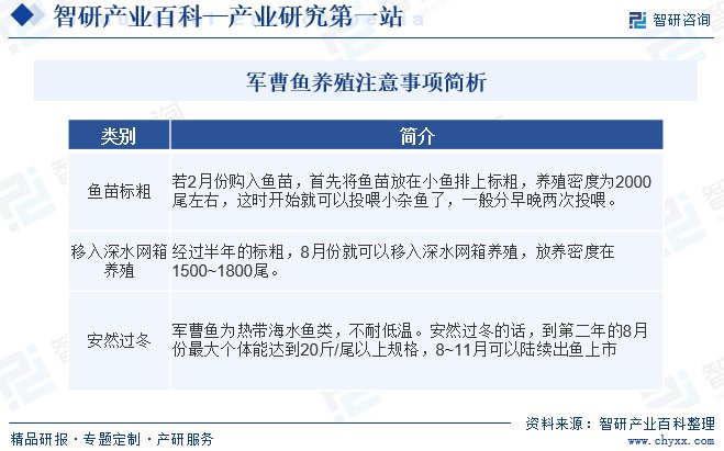 整体来看目前国内军曹鱼养殖主要是以网箱养殖为主,其养殖周期为1.5-2年。为保证成活率和生长速度,军曹鱼养殖一般要先进行标粗。每年2月,购回来的苗种先要在4米×4米×2.5米的小渔排上标粗,养殖密度为2000尾左右,这时开始就可以投喂小杂鱼了,一般分早晚两次投喂。经过半年的标粗,月份就能长至3-4斤规格,这个时候可以移入深水网箱养殖,周长40米的深水网箱放养密度在1500-1800尾。安然过冬的话,到第二年的8月份最大个体能达到20斤/尾以上规格,8-11月可以陆续出鱼上市。其次渔业养殖存在明显的区域性,对水域、气候、生态环境的要求较为严格。资源壁垒要求进入企业必须拥有适宜水产品养殖的水域资源。