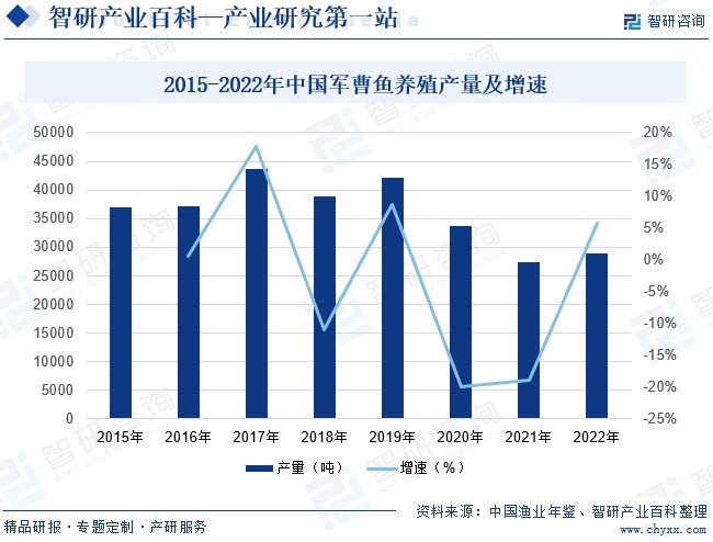 军曹鱼养殖半年可达1.5~2公斤,1年可达6~8公斤,2年可达10公斤以上,生长速度快,经济价值高,显示出巨大的养殖前景。军曹鱼全人工繁殖及规模化育苗技术获得成功后,国内养殖规模迅速扩大,现已成为我国南方沿海一带的重要网箱水养殖品种。据统计,截至2022年我国军曹鱼产量为28971吨,同比增长5.7%。其中广东与海南是我国军曹鱼主要养殖地区,2022年产量分别为20838吨与8015吨,合计占比99.6%。