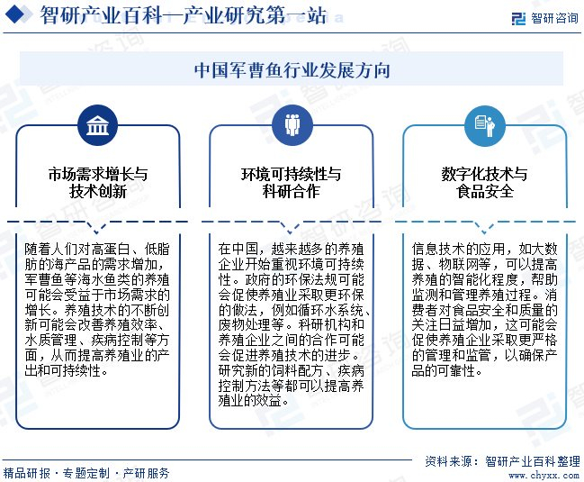 20世纪前十年投入军曹鱼养殖行业的大多数养殖者均在前十年末放弃,理由通常是不赚钱。也可能是因为军曹鱼供过于将销售价格压低至生产成本以下。军曹鱼需要较高的养殖成本,且饲养大规格鱼没有经济可行性。由于成本高的原因,军曹鱼养殖业限制了一大批普通养殖户的进入。小型渔业公司也会因为军曹鱼养殖周期较长,资金压力大而放弃养殖军曹鱼。未来我国军曹鱼养殖行业朝市场需求增长与技术创新、环境可持续性与科研合作、数字化技术与食品安全方向发展。