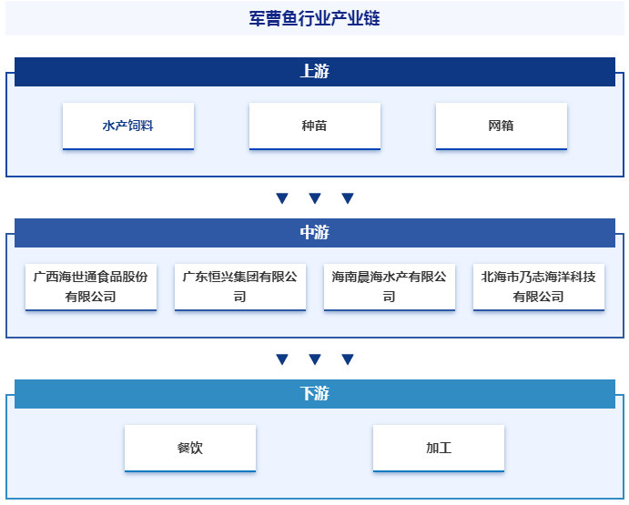 军曹鱼产业上游是种苗、水产饲料、网箱等,中游是军曹鱼养殖,下游是最终消费者、餐饮业和军曹鱼加工业。我国军曹鱼资源较少,天然种苗匮乏,长期来养殖生产所需种苗主要依靠境外输入,苗价高,数量不稳定,制约了该鱼养殖规模的进一步发展。近年来,我国开展了军曹鱼人工繁殖技术研究,大规模繁育种苗的技术已取得突破,并在生产中推广应用。目前,养殖军曹鱼主要使用冰鲜杂鱼,幼鱼阶段也使用人工配合饲料。冰鲜鱼具有储存较困难,容易腐败变质和滋生病菌以及造成养殖水体富营养化等缺点,已远远不能满足其集约化养殖的需要。相反,配合饲料具有营养全面,容易运输存储,对养殖水体污染少,有利于养殖产业健康发展等优点,值得大力推广应用。