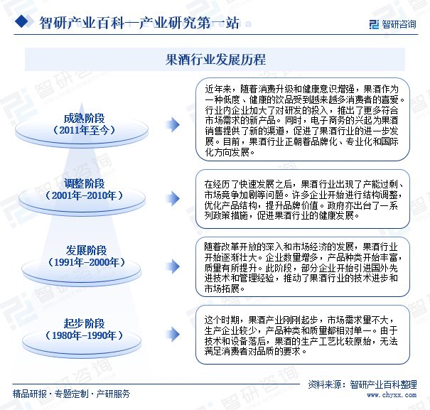 我国果酒行业的发展历程可以概括为起步期、发展期、调整期和成熟期四个阶段。如今,果酒行业已进入成熟期,消费者对果酒的健康属性和品质要求不断提高,推动着行业向品牌化、专业化和国际化方向发展。整体来看,我国果酒行业经历了从小到大、从弱到强的发展过程,展现出了良好的发展潜力和市场前景。