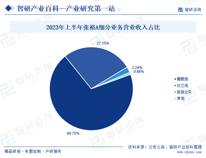 烟台张裕集团有限公司其前身为烟台张裕酿酒公司,是由中国近代爱国侨领张弼士先生创办的中国第一个工业化生产葡萄酒的厂家。公司从事的主要业务为生产经营葡萄酒和白兰地,从而为国内外消费者提供健康、时尚的酒类饮品,其中葡萄酒主要有龙谕、爱斐堡、黄金冰谷、解百纳、张裕、醉诗仙、味美思、瑞那、巴保男爵、多名利、爱欧、歌浓和魔狮等品牌。2023年以来,公司针对解百纳等葡萄酒产品,聚焦宴席场景,持续实施宴席推广,力争通过宴席场景的突破,实现所在城市销量突破,带动营业收入持续增长。2023年上半年期间,张裕A葡萄酒业务的营业收入为13.72亿元,占比69.75%。