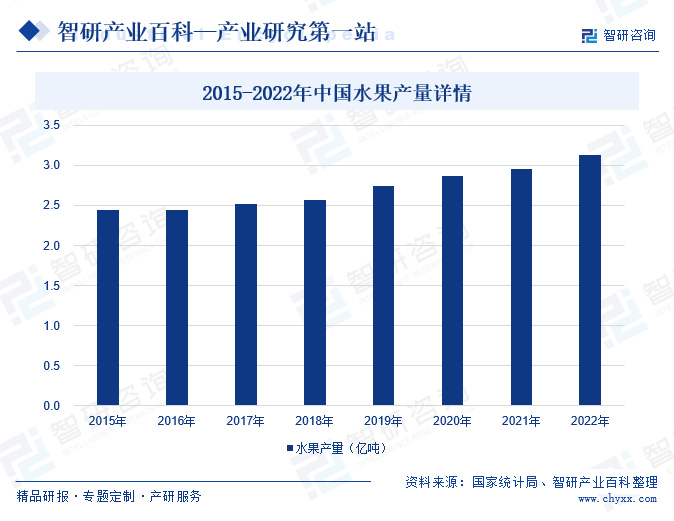 摘要:中国是世界上水果生产大国,水果种类繁多,产量丰富。国家统计局数据,近年来我国水果种植面积和总产量均保持稳定增长,2022年我国水果产量为3.13亿吨,其中,苹果、柑橘、香蕉、梨、葡萄等主要水果品种的产量居世界前列。各类水果产品作为我国果酒行业的重要原材料,随着水果行业产量不断增长,水果质量持续提升,有望带动我国果酒行业高质量可持续发展,未来,在水果加工业的持续发展下,果酒企业将更为注重产品的深加工和附加值提升,推动了产业结构的优化和技术进步。