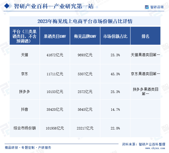 梅见青梅酒作为一款中式佐餐酒,2019年上市,拥有全国线上线下渠道,已占据国内梅酒品类市场占有率第一的地位,是重庆江记酒庄有限公司推出的青梅酒品牌。梅见青梅酒以“自然,健康,轻松”为产品理念,以复兴中国传统酒饮为品牌使命,满足当下“年轻态人群”对健康、利口、多元化的体验需求。2023年以来,公司持续深化各大电商平台的市场布局,持续拓宽产品销售渠道,不断加大梅见产品的宣传力度,推动梅见产品GWV不断提高。2023年期间,梅见产品在天猫、京东、拼多多等多个平台的果酒类目中位居首位,市场份额占比分别达到23.2%、45.3%、25.3%。