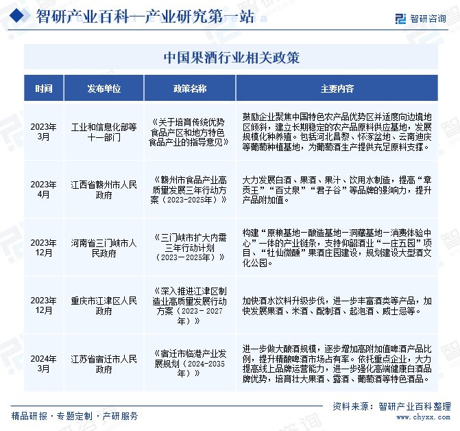 近年来,随着人们健康消费意识的提升,以葡萄酒为代表的果酒产业正迎来新的发展机遇期,我国成为亚洲地区重要的果酒生产和消费国。在多样化市场需求的拉动下,国家和政府部门相继出台多项政策,大力扶持和鼓励果酒行业发展,如《关于培育传统优势食品产区和地方特色食品产业的指导意见》等政策,从原材料种植出发,积极培育优质水果供应基地,发展规模化种养殖。同时,各地政府部门积极响应国家号召,陆续出台《三门峡市扩大内需三年行动计划(2023—2025年)》《深入推进江津区制造业高质量发展行动方案(2023-2027年)》《宿迁市临港产业发展规划(2024-2035年)》等多项政策措施,助力果酒行业健康有序发展。