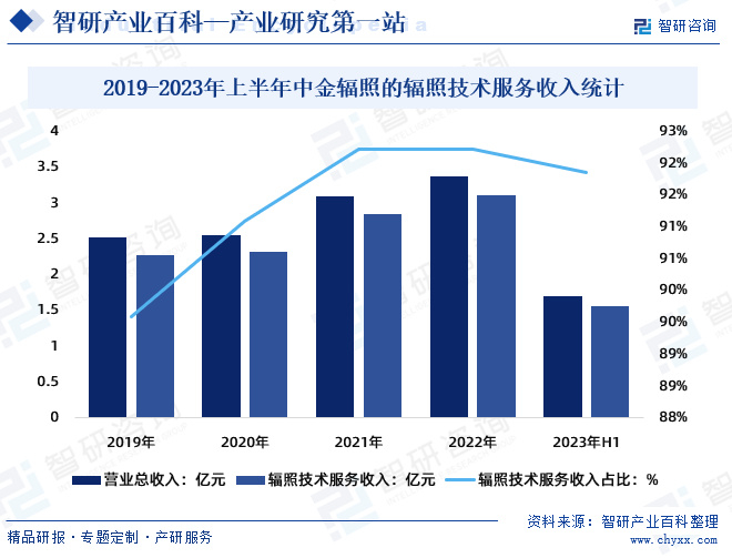 中金辐照股份有限公司是中国最早将辐照技术进行工业化应用的企业之一,经过多年的发展,在辐照装置的应用技术、辐照自控系统与信息化技术、产品灭菌的开发和控制技术等方面形成了多项核心技术。目前,中金辐照已成为中国辐照加工行业的领军企业之一,形成包括深圳、上海、天津、青岛、武汉、成都和重庆等多地的全国性布局,拥有11座大型辐照装置,是中国钴源活度最高、网点布局最完善、覆盖面最广的专业化辐照灭菌企业,“中金辐照”、“金鹏源”已发展成为业内知名的品牌。2022年中金辐照营业总收入3.37亿元,其中:辐照技术服务收入3.11亿元,占92.23%;2023年上半年,中金辐照营业总收入1.70亿元,其中:辐照技术服务收入1.56亿元,占91.86%。