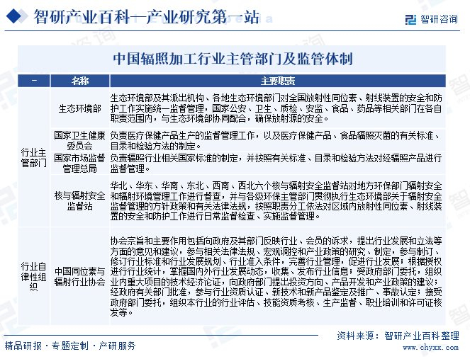 辐照加工行业的主要监督管理部门为生态环境部,国家卫生健康委员会、国家市场监督管理总局等部门负责医疗保健产品生产的监督管理工作,以及医疗保健产品、食品辐照灭菌的有关标准、目录和检验方法的制定。行业的自律性组织为中国同位素与辐射行业协会,协会由行业内从事生产、制造、供应的企业以及大学、研究机构和终端用户组成。