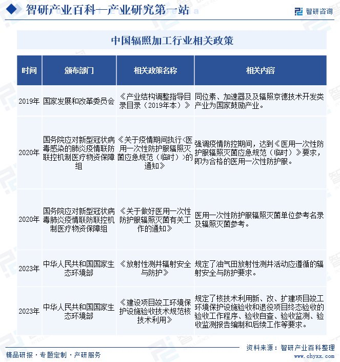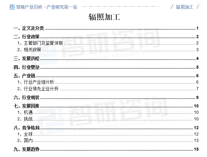 智研产业百科是智研咨询推出的产研工具平台,致力于为您提供全方位的百科式产业信息查询服务。智研咨询践行用信息驱动产业发展的企业使命,完善和丰富企业方法论,依托产业百科平台提升信息价值,持续为行业发展及企业投资决策赋能。辐照加工产业百科作为辐照加工产业一站式系统化研究工具,全面归纳了辐照加工产业知识信息,内容涵盖辐照加工产业的定义、分类、政策、产业链、竞争格局、发展趋势等,并依靠信息技术建立智能互链的行业知识图谱,为行研从业者及相关投资者提供深入的洞察力和全面的信息。