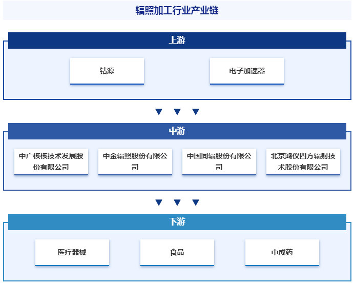 辐照加工产业链上游主要是钴源供应商和电子加速器供应商,中游主要是同位素辐照加工站和电子加速器辐照加工站,下游主要是辐照加工的服务对象。