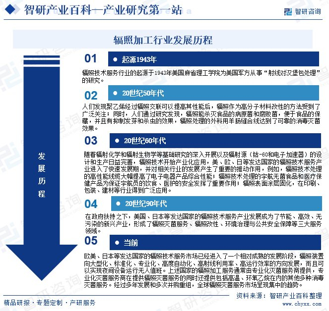 辐照加工行业的起源于1943年美国麻省理工学院为美国军方从事“射线对汉堡包处理”的研究。20世纪50年代,人们发现聚乙烯经过辐照交联可以提高其性能后,辐照作为高分子材料改性的方法受到了广泛关注。经过几十年的发展,应用领域不断扩大,行业不断发展壮大,辐照加工为推动产业升级、提升产品质量和保障公共安全发挥了重要作用。辐照加工行业发展历程具体如下: