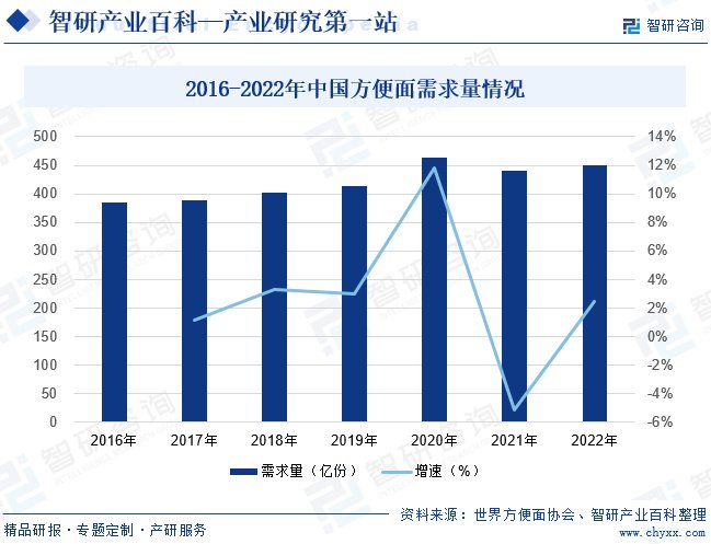 摘要:方便面行业以农业为基础,也反哺着农业的发展,不仅提高了农民的收入,还通过研发、培育优质小麦品种,提高小麦产量,助力“乡村振兴”的发展;最后,方便面食品也常常作为救援物资在抗震救灾中扮演着不可或缺的角色。近年来我国方便面需求量整体呈增长态势,据统计,截至2022年我国方便面需求量为450.7亿份,同比增长2.46%。