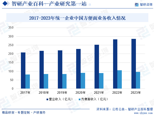 统一企业中国控股有限公司是市场领先的方便面及饮料制造商之一,生产能力涵盖方便面、果汁、即饮茶、奶茶、咖啡等,其中汤达人、统一阿萨姆奶茶等均在市场占据领导地位。公司母公司为统一集团,是中国台湾最大的食品饮料集团,亦是全球前20大的食品帝国。2023年随着疫情消退,消费稳步扩大,市场需求逐渐复苏回暖,消费趋于理性;方便面市场发展发生显著且激烈的变化,主要表现在消费场景的转移,但高性价比产品依旧是主流消费,同时也更加重视健康、安全、创新,据统计,2023年统一企业中国营业收入为285.9亿元,同比增长1.18%,其中方便面业务收入为95.94亿元,同比下降9.7%。