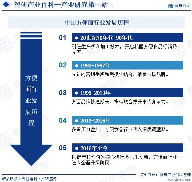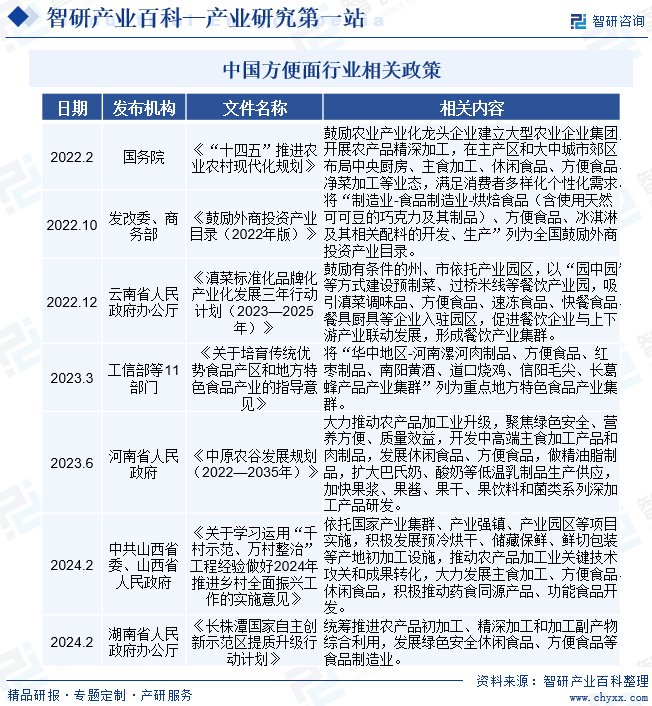智研产业百科是智研咨询推出的产研工具平台,致力于为您提供全方位的百科式产业信息查询服务。智研咨询践行用信息驱动产业发展的企业使命,完善和丰富企业方法论,依托产业百科平台提升信息价值,持续为行业发展及企业投资决策赋能。方便面产业百科作为方便面产业一站式系统化研究工具,全面归纳了方便面产业知识信息,内容涵盖方便面产业的定义、分类、政策、产业链、竞争格局、发展趋势等,并依靠信息技术建立智能互链的行业知识图谱,为行研从业者及相关投资者提供深入的洞察力和全面的信息。