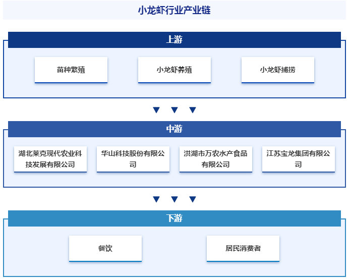 我国小龙虾消费市场持续放大,从上游苗种繁殖、小龙虾养殖、捕捞到下游消费,形成了一条完整的产业链。苗种繁育、小龙虾养殖、小龙虾捕捞位于小龙虾上游,其中小龙虾养殖在一定程度上决定了小龙虾的成本。餐饮加工位于小龙虾行业下游,目前,我国已经形成了一大批小龙虾知名菜肴和餐饮品牌,有效推动了小龙虾餐饮消费向深度发展,小龙虾无论是门店数量、消费量、口味品种还是人均消费都快速提升。