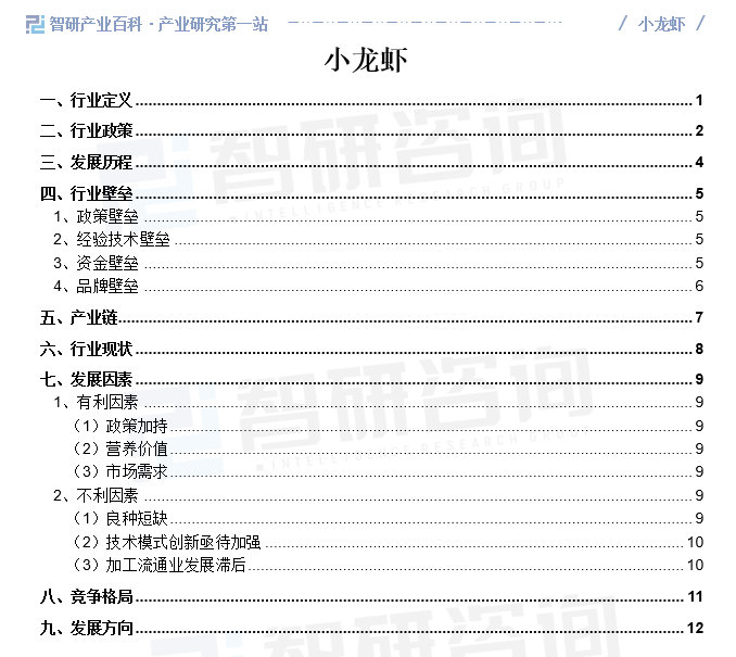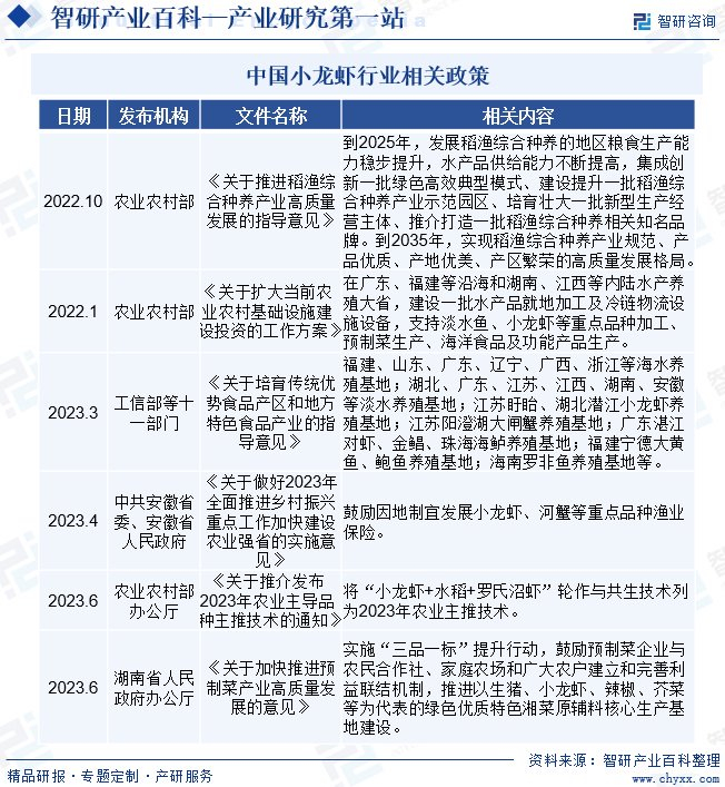 智研产业百科是智研咨询推出的产研工具平台,致力于为您提供全方位的百科式产业信息查询服务。智研咨询践行用信息驱动产业发展的企业使命,完善和丰富企业方法论,依托产业百科平台提升信息价值,持续为行业发展及企业投资决策赋能。小龙虾产业百科作为小龙虾产业一站式系统化研究工具,全面归纳了小龙虾产业知识信息,内容涵盖小龙虾产业的定义、分类、政策、产业链、竞争格局、发展趋势等,并依靠信息技术建立智能互链的行业知识图谱,为行研从业者及相关投资者提供深入的洞察力和全面的信息。