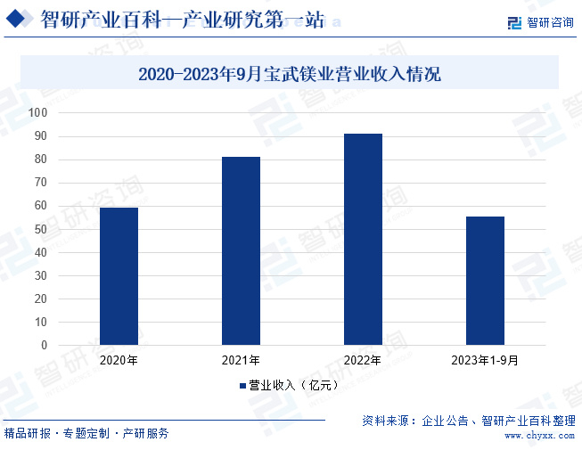 宝武镁业前身为云海金属集团,成立于1993年,2007年在深交所上市。公司经过三十多年的发展,成为了一家集矿业开采、有色金属冶炼及加工为一体的高新技术企业,致力成为全球镁产业引领者。宝武镁业产品广泛应用于航空航天、大交通、新能源汽车、绿色建筑、消费电子及新基建等领域。作为全球轻金属材料领域的领军者,公司拥有完整的产品研发与制造能力。镁及镁合金产品的市场份额全球领先,形成了“白云石开采-原镁冶炼-镁合金熔炼-镁合金加工-镁合金回收”完整镁产业链。2022年,宝武镁业营业收入达91.05亿元,同比增长12.17%。2023年1-9月,营业收入为55.63亿元,同比上年同期减少21.74%。