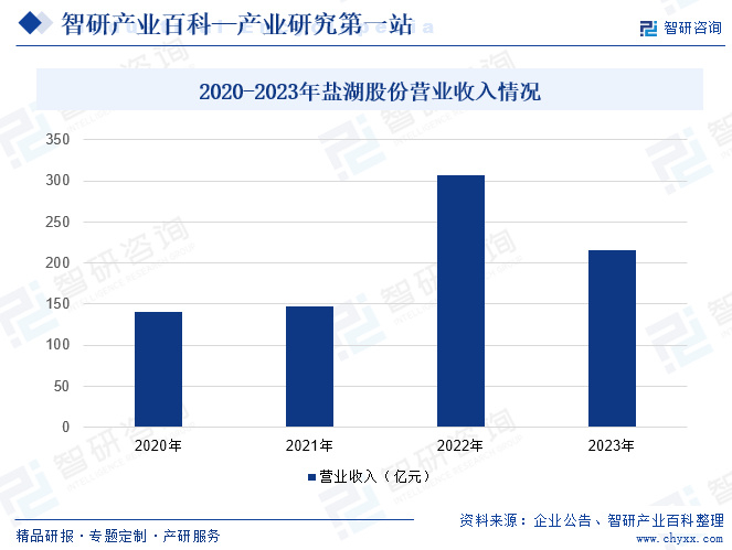 盐湖股份依托其丰富的镁资源优势,通过已建成的中试基地,与企业、高校、研究院所开展紧密合作,引进新的开发技术,实现了盐湖镁资源开发的新突破。这种产学研结合的模式不仅推动了镁矿业务的技术进步,也为公司的长远发展奠定了坚实的基础。盐湖股份拥有的察尔汗盐湖是一个大型内陆综合性盐湖,主要开采钾盐,但伴生有镁、钠、锂、硼、碘等多种矿产。其中,氯化镁的储量为16.5亿吨,占全国首位。2022年,盐湖股份营业收入达307.48亿元,同比增长108.06%。2023年,盐湖股份营业收入下降至215.79亿元,同比减少29.8%。