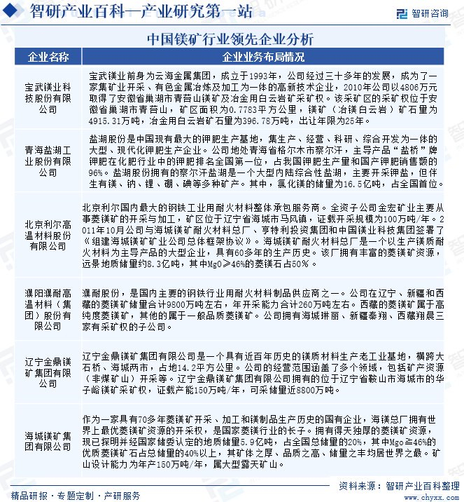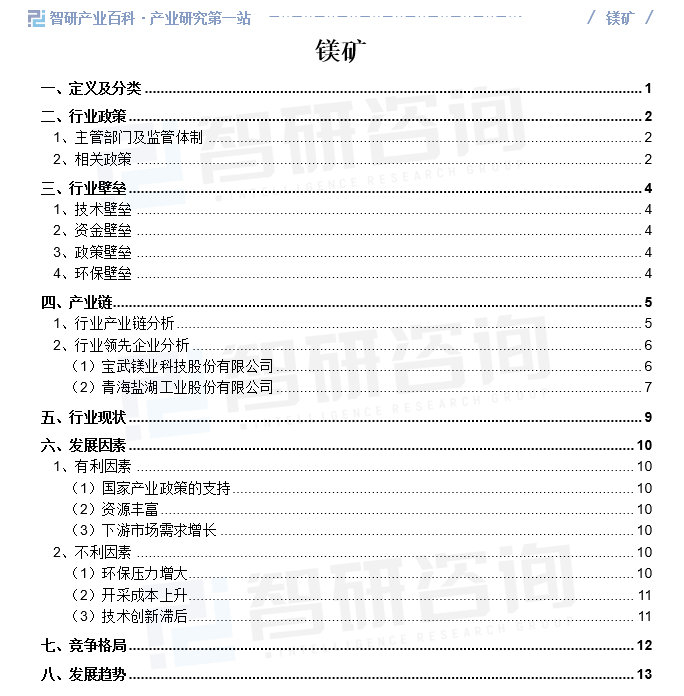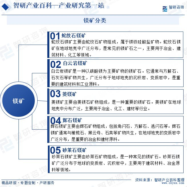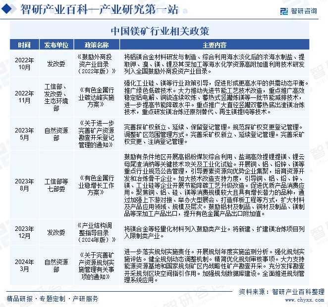 智研产业百科是智研咨询推出的产研工具平台,致力于为您提供全方位的百科式产业信息查询服务。智研咨询践行用信息驱动产业发展的企业使命,完善和丰富企业方法论,依托产业百科平台提升信息价值,持续为行业发展及企业投资决策赋能。镁矿产业百科作为镁矿产业一站式系统化研究工具,全面归纳了镁矿产业知识信息,内容涵盖镁矿产业的定义、分类、政策、产业链、竞争格局、发展趋势等,并依靠信息技术建立智能互链的行业知识图谱,为行研从业者及相关投资者提供深入的洞察力和全面的信息。