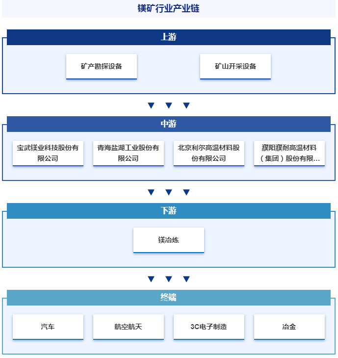 从上游来看:资源的供给状况直接决定了镁矿行业的基础。镁矿资源的分布、储量大小以及开采难度都会影响到行业的供应能力和成本。此外,高质量的勘探设备和高效、环保的矿山开采设备对镁矿行业的发展至关重要,它们能够帮助企业提升资源勘探成功率,降低开采成本,提高生产效率和产品质量。
