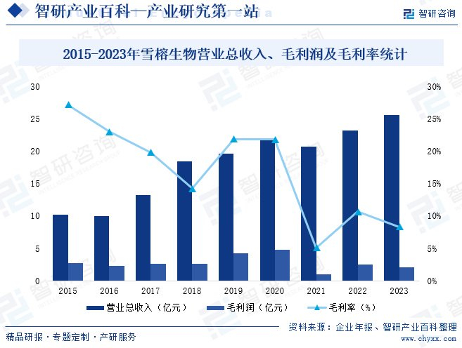 上海雪榕生物科技股份有限公司始创于1995年,主营鲜品食用菌的研发、工厂化种植与销售。截止2022年1月,雪榕生物已在上海、成都、长春、德州、惠州、毕节、临洮等地建成7大生产基地,拥有18家智能化、标准化食用菌农厂,形成了金针菇、白玉菇、蟹味菇、海鲜菇、杏鲍菇、香菇、鹿茸菌、灰树花等多品种矩阵系列。从营收情况来看,2023年雪榕生物营业总收入达25.65亿元,毛利润2.15亿元,毛利率为8.38%。