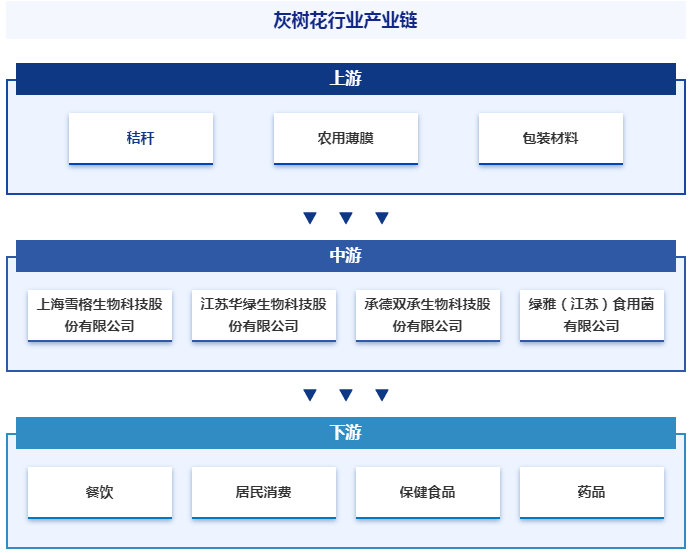 灰树花行业上游主要包括秸秆、农用薄膜、包装材料等,灰树花肉质脆嫩爽口,深受食客喜爱,此外,灰树花还具有十分珍贵的药用价值,大量研究表明,从其子实体或菌丝体中提取出的灰树花多糖具有显著的抗肿瘤、降血糖、抗肝炎、抗HIV病毒以及改善免疫系统功能等功效,因此灰树花工业上多用于保健食品以及药品行业,除此之外,灰树花在化妆品等领域也有一定的应用前景,主要作为抗氧化剂来保护皮肤免受氧自由基的毒害和作为激活剂来增强受到紫外线等伤害的组织自我修复的能力。