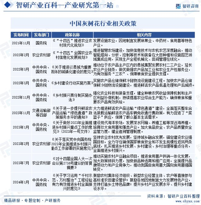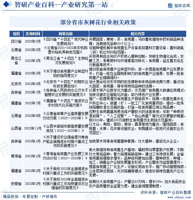 近年来,我国相关部门发布一系列政策支持、鼓励和规范包括灰树花在内的食用菌行业发展,如:2023年7月,农业农村部发布《对十四届全国人大一次会议第2756号建议的答复摘要》,指出:推动实施农村产业融合项目,推进食用菌产供销一体化发展,加大政策倾斜力度,加快新品种选育和推广应用,全面提升品牌带动力和产业竞争力,推动我国由食用菌大国向食用菌强国转变。2024年1月,中共中央、国务院发布《关于学习运用“千村示范、万村整治”工程经验有力有效推进乡村全面振兴的意见》,指出: 鼓励农村集体经济组织、新型农业经营主体、农户等直接参与高标准农田建设管护;鼓励各地因地制宜大力发展特色产业,支持打造乡土特色品牌;提升乡村产业发展水平、提升乡村建设水平。