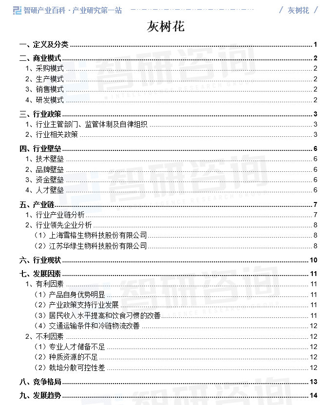 智研产业百科是智研咨询推出的产研工具平台,致力于为您提供全方位的百科式产业信息查询服务。智研咨询践行用信息驱动产业发展的企业使命,完善和丰富企业方法论,依托产业百科平台提升信息价值,持续为行业发展及企业投资决策赋能。灰树花产业百科作为灰树花产业一站式系统化研究工具,全面归纳了灰树花产业知识信息,内容涵盖灰树花产业的定义、分类、政策、产业链、竞争格局、发展趋势等,并依靠信息技术建立智能互链的行业知识图谱,为行研从业者及相关投资者提供深入的洞察力和全面的信息。