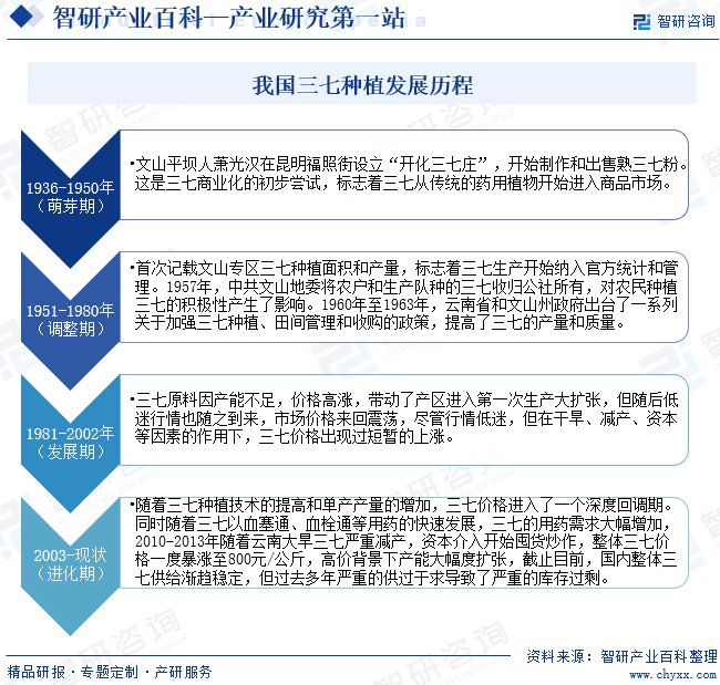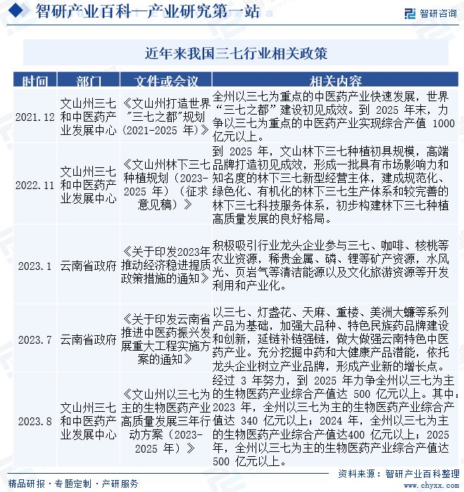 智研产业百科是智研咨询推出的产研工具平台,致力于为您提供全方位的百科式产业信息查询服务。智研咨询践行用信息驱动产业发展的企业使命,完善和丰富企业方法论,依托产业百科平台提升信息价值,持续为行业发展及企业投资决策赋能。三七产业百科作为三七产业一站式系统化研究工具,全面归纳了三七产业知识信息,内容涵盖三七产业的定义、分类、政策、产业链、竞争格局、发展趋势等,并依靠信息技术建立智能互链的行业知识图谱,为行研从业者及相关投资者提供深入的洞察力和全面的信息。