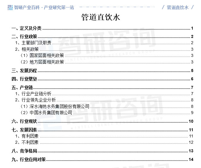 智研产业百科是智研咨询推出的产研工具平台,致力于为您提供全方位的百科式产业信息查询服务。智研咨询践行用信息驱动产业发展的企业使命,完善和丰富企业方法论,依托产业百科平台提升信息价值,持续为行业发展及企业投资决策赋能。管道直饮水产业百科作为管道直饮水产业一站式系统化研究工具,全面归纳了管道直饮水产业知识信息,内容涵盖管道直饮水产业的定义、分类、政策、产业链、竞争格局、发展趋势等,并依靠信息技术建立智能互链的行业知识图谱,为行研从业者及相关投资者提供深入的洞察力和全面的信息。