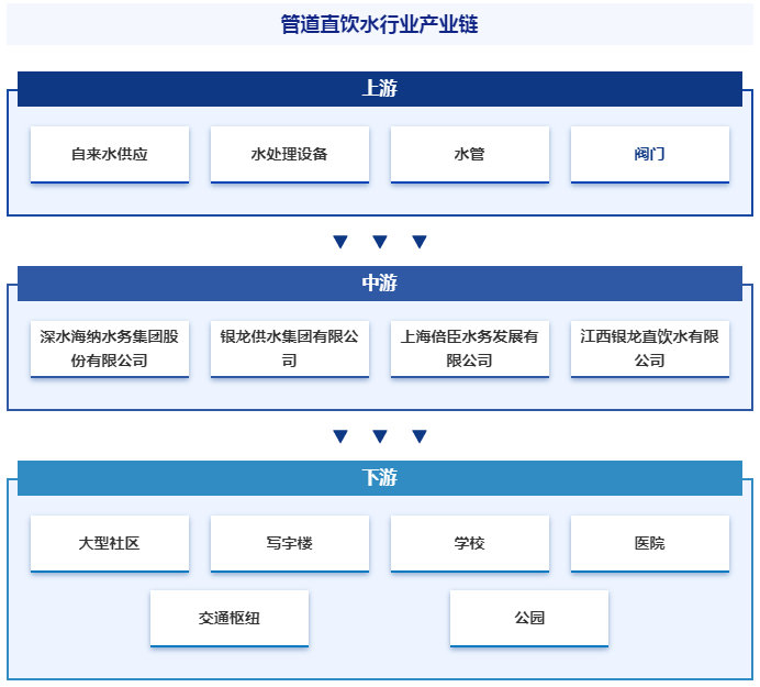 行业下游用户服务是管道直饮水行业的最终环节,主要包括用户接入、水费收取、用户服务与支持等,下游客户类型较多,客户包括全国各地的水务公司、地产商、建筑商、业主等。目前国内经济发达地区的大型社区、写字楼、学校、医院、交通枢纽、公园和步行街等公共场所内大多已设置管道直饮水系统。行业终端是广大消费者。