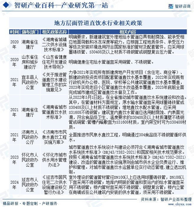 全国各地方政府出台为响应国家号召,也相继出台的一系列政策和标准,推动管道直饮水行业的发展,如《宜丰县人民政府关于推进管道直饮水建设管理工作的实施意见》《怀化市城市供水用水管理办法》《延吉市居民住宅二次供水设施建设移交暂行办法》等等。