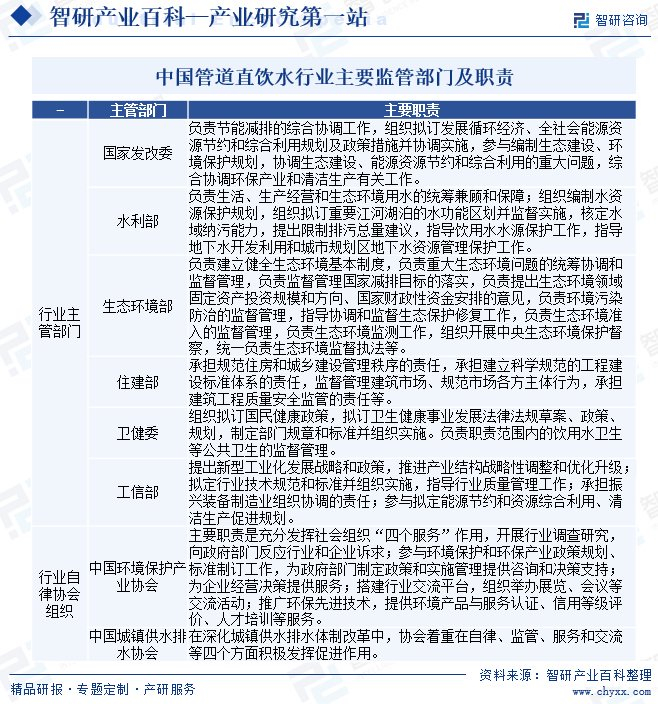 管道直饮水行业既与城市基础设施建设相关,又涉及环境保护中的水资源保护和水污染治理。因此,管道直饮水行业主管部门主要包括国家发改委、水利部、生态环境部、住建部、卫健委、工信部。行业自律协会组织为中国环境保护产业协会、中国城镇供水排水协会。