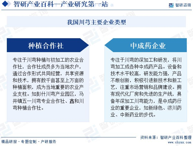 我国川芎行业的竞争企业主要包括两大类,一种以彭什川芎产业园区、马井镇五一川芎专业合作社和鑫和川芎种植合作社为代表的种植合作社,专注于川芎的种植与初加工,通过合作形式整合当地农户资源,拥有数千亩至上万亩的种植面积,成为川芎产业链上游的重要支撑;另一种中成药企业如新绿色、济川药业和中新药业等,则聚焦于川芎的深加工和研发,凭借先进的生产设备、强大的研发能力和精细化的市场营销,成功将川芎加工成多种中成药产品,满足市场需求,成为川芎相关产品领军企业,两类企业相互依存、共同发展,共同推动了我国川芎产业的持续繁荣和升级。