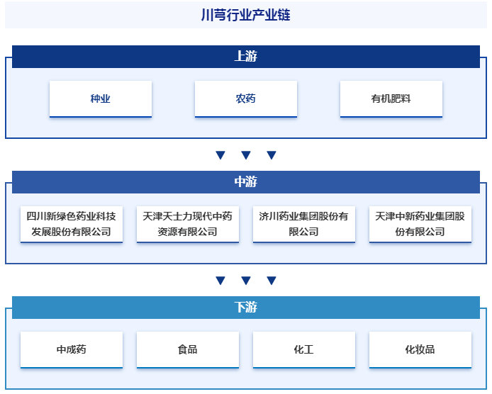 我国川芎行业产业链涵盖上游的种业、农药和有机肥料供应,中游的川芎种植与加工企业,以及下游的多元化应用领域。上游产业链主要为川芎种植提供种子、农药和有机肥料等生产资料,确保川芎种植的质量和产量。中游则是川芎种植和加工的核心环节,由多家知名企业如四川新绿色药业科技发展股份有限公司、天津天士力现代中药资源有限公司等引领,拥有先进的种植技术和加工设备,还致力于提升川芎的品质和价值。下游则涉及中成药、食品、化工和化妆品等多个领域,川芎的药用价值和健康功效在这些领域得到广泛应用,拓宽了川芎产业链的发展空间。