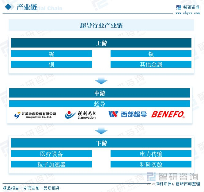从产业链来看,超导产业主要由三部分组成:上游是矿产资源,如铌、钛、钡、铋、锶等金属,是超导行业的基础;中游是超导材料如YBCO和BSCCO等带材,是超导行业的核心;下游是由超导材料制作成的超导应用产品,如超导电缆、超导限流器、超导储能器、超导发电机、超导滤波器和超导变压器等,是超导行业的应用载体,主要应用于医疗设备(MRI、NMR)、电力传输、粒子加速器、科研实验、交通运输(如磁悬浮列车)等。