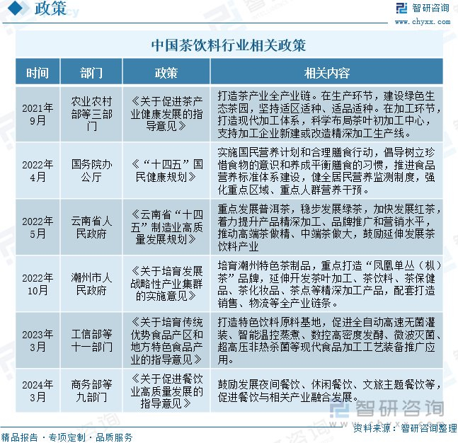 注:本文节选出自智研咨询发布的《研判2024!中国茶饮料行业相关政策、市场规模、重点企业分析及未来前景:随着消费者需求的多样化,茶饮料品类将逐渐丰富[图]》行业分析文章,如需获取行业文章全部内容,可进入智研咨询官网搜索查看。