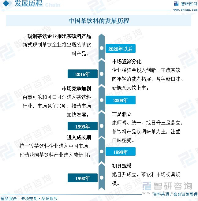 我国茶饮料行业起步较晚,1993年,旭日升成立,我国茶饮料市场初具规模。但我国茶饮料市场早期品牌较少,产品类型也较为单一,市场集中在少数公司手中,行业发展相对缓慢。随着改革开放的深入,我国茶饮料行业开始蓬勃发展,品牌多样化、产品丰富化推动市场竞争加剧。尤其在2015年后,许多茶饮料企业意识到产品创新的重要性,推出各种新口味茶饮料。同时,消费市场需求升级,少糖、零脂的健康饮料也陆续上市,我国茶饮料市场进一步加剧。2020年后,我国新式现制茶饮蓬勃发展,相关企业还推动了瓶装茶饮料产品,激烈的市场竞争推动企业提质发展。