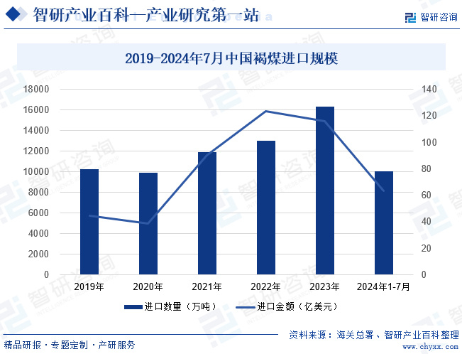 我国虽煤炭资源储量丰富,但煤炭开采并非易事。同时,随着工业化和城市化进程加快,市场能源消费需求日益增长。而煤炭目前仍是我国能源体系供应的主体能源,因此,保持国家煤炭资源供需平衡成为保障国家能源供应稳定的重点。褐煤作为煤炭生产四大煤品种之一,其进口市场成为稳定国家煤炭供应的关键之一。近年来,随着国内煤炭消费需求增加,我国褐煤行业进口市场规模日益扩大。海关总署数据显示,2023年全国褐煤进口数量及进口金额分别为16314.22万吨、115.87亿美元,同比增长率分别为25.18%、-6.08%;2024年1-7月,行业进口数量及进口金额分别为10028.47万吨、63.42亿美元,同比增长率分别为5.86%、-14.65%。
