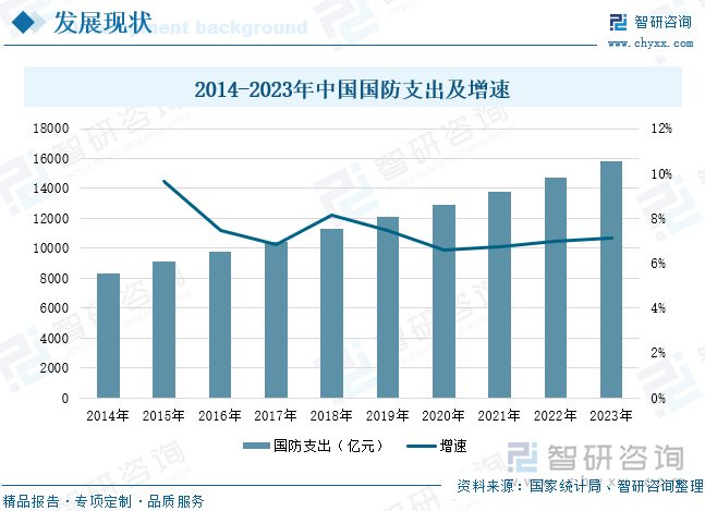 军工电子行业的发展与军工行业整体发展环境和发展阶段密切相关,而军工行业的发展前景取决于我国的国防战略。近年来,全球矛盾日益尖锐,国家安全问题也越来越受到重视。2024年7月,中共中央发布《关于进一步全面深化改革 推进中国式现代化的决定》,其中提到要持续深化国防和军队改革。必须坚持党对人民军队的绝对领导,深入实施改革强军战略,为如期实现建军一百年奋斗目标、基本实现国防和军队现代化提供有力保障。为实现上述战略目标,我国的国防投入逐年增加,据统计,2014年以来中国国防支出保持不断增长,2023年国防支出达到15805.12亿元,同比上升7.14%。随着国防支出的不断增加,武器装备升级替换需求将进一步加大,从而带动上游军工电子的需求快速增长。