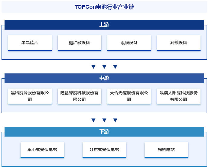 TOPCon电池行业产业链上游主要生产TOPCon电池所需的原材料和核心制备设备。原材料涉及高纯多晶硅、单晶硅片、银浆等,其中硅片是电池的基础材料,对电池性能有直接影响。核心制备设备则包括清洗制绒设备、硼扩散设备、镀膜设备(如LPCVD、PECVD)、刻蚀设备、丝网印刷机等,这些设备用于制造过程中的不同阶段,对电池的最终性能和质量起到关键作用。产业链中游是TOPCon电池的生产制造环节。产业链下游主要涉及TOPCon电池的应用领域,包括集中式光伏电站、分布式光伏电站、光热电站等。