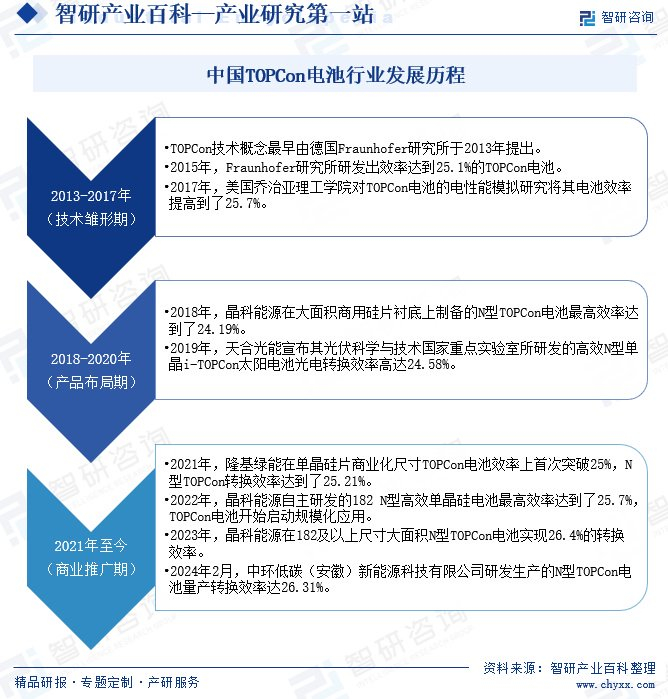 中国TOPCon电池行业发展主要经历了三个阶段。2013年至2017年的技术雏形期,TOPCon技术概念最早由德国Fraunhofer研究所于2013年提出。2015年,Fraunhofer研究所研发出效率达到25.1%的TOPCon电池。2017年,美国乔治亚理工学院对TOPCon电池的电性能模拟研究将其电池效率提高到了25.7%。
