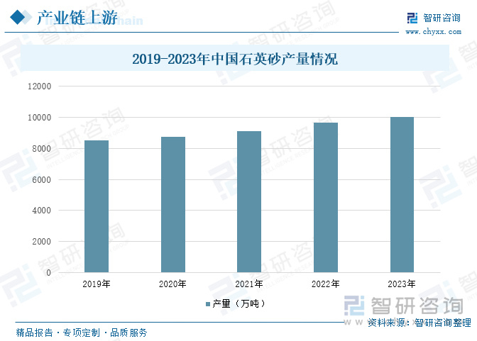 我国是石英砂生产大国,产量丰富且呈现逐年增长的趋势。在产量分布上,具有明显的区域集中性。2022年我国石英砂产量达到9407万吨,同比增长3.11%。2023年产量约为10038万吨。石英砂是建筑陶瓷生产中的基础原料之一,特别是其高纯度的二氧化硅(SiO2)含量,使其成为陶瓷配方中的关键成分。石英砂的加入能够显著提升陶瓷产品的物理和化学性能,如硬度、耐磨性、耐高温性等。这些性能的提升有助于延长陶瓷产品的使用寿命,并使其在各种恶劣环境下保持稳定的性能。