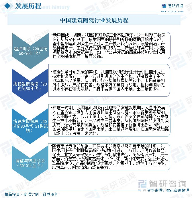 注:本文节选出自智研咨询发布的《2025年中国建筑陶瓷行业产业链、发展历程、发展现状及趋势研判:我国建筑陶瓷行业随着产品品质的提升和品牌建设的推进,在欧美等高端市场的份额在逐步扩大 [图]》行业分析文章,如需获取行业文章全部内容,可进入智研咨询官网搜索查看。