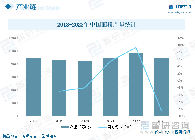 面馆行业上游主要包括面粉、肉类、禽类、海鲜、蔬菜、调味料、酒水饮料、餐饮设备及用品等,其中,面粉是制作面条最基础原材料,面粉的质量直接影响面条的口感,2023年我国面粉产量从2018年的8875.0万吨增至8901.2万吨,我国面粉供给较为稳定,为面馆行业发展打下扎实的基础。