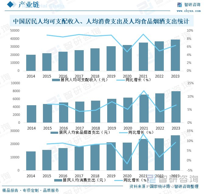 近年来,我国国民收入和消费水平不断提升,据国家统计局数据显示,2023年我国居民人均可支配收入达39218元,同比增长6.3%,居民人均消费支出达26796元,同比增长9.2%,随着居民人均可支配收入不断增加,消费者在餐饮方面的支出预算更为宽松,愿意为高品质、特色化的面食产品支付更高价格,据国家统计局数据显示,2023年我国居民人均食品烟酒支出达7983元,同比增长6.7%,与此同时,消费者餐饮消费观念也发生变化,从单纯注重饱腹转向追求健康、营养、独特的用餐体验,面馆需要不断创新产品,采用优质食材、研发新口味、优化就餐环境,以满足消费者需求,推动面馆行业向高端化、品质化方向发展。