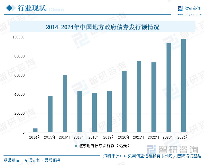 2024年,中国地方政府债券发行额为97760.88亿元,同比增长4.83%。中央经济工作会议提出实施更加积极的财政政策,提高财政赤字率,增加地方政府专项债券发行额度,并扩大其投向领域。这一政策导向推动了地方政府债券发行规模的扩大,以支持“两重”项目(重大工程、重点民生项目)和“两新”政策(新型城镇化、新型基础设施建设)的实施。同时,为了化解地方政府存量隐性债务风险,中国政府采取了一系列措施,包括允许部分新增地方政府债券置换存量隐性债务。这一政策使得地方政府能够通过发行新债券来置换原有的隐性债务,从而优化债务结构、降低尾部风险。