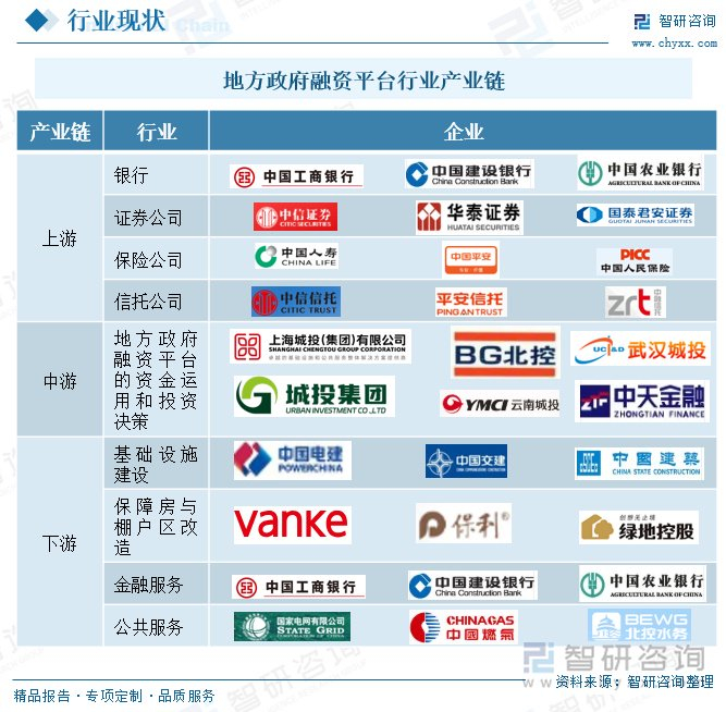 地方政府融资平台行业产业链上游主要涉及地方政府融资平台的设立、资金筹措以及相关服务的提供。其中,地方政府及其部门和机构是地方政府融资平台的主要设立主体。资金筹措主要通过政府财政资金、专项基金、发行债券、银行贷款、非标融资(如信托贷款、委托贷款等)等多种方式筹集资金,其资金提供方包括地方政府、银行、证券公司、保险公司、信托公司等。相关服务则包括债券评级、会计审计、法律咨询等。产业链中游主要涉及地方政府融资平台的资金运用和投资决策。产业链下游主要包括基础设施建设、土地整理与开发、公用事业、公共服务、产业园区开发、保障房与棚户区改造、金融服务等行业。