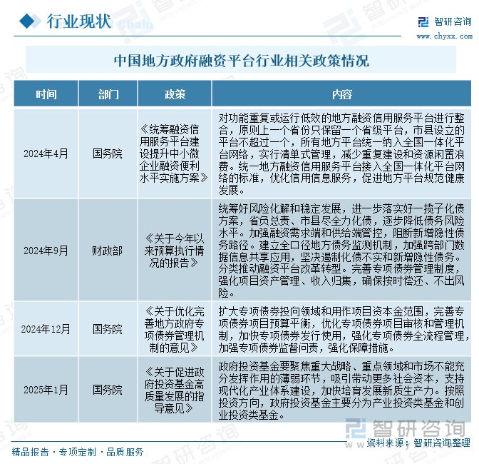 注:本文节选出自智研咨询发布的《研判2025!中国地方政府融资平台行业相关政策、行业现状及发展趋势分析:积极化解存量隐性债务风险,推动地方政府融资平台稳健发展[图]》行业分析文章,如需获取行业文章全部内容,可进入智研咨询官网搜索查看。